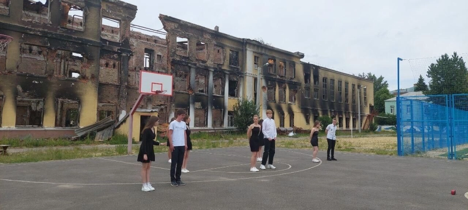 Фото — Выпускники школы в Харькове танцуют на фоне развалин своей школы. На праздник пришла только треть учеников, остальные уехали их Харькова. Июнь 2022 unicef.org © Suspilne