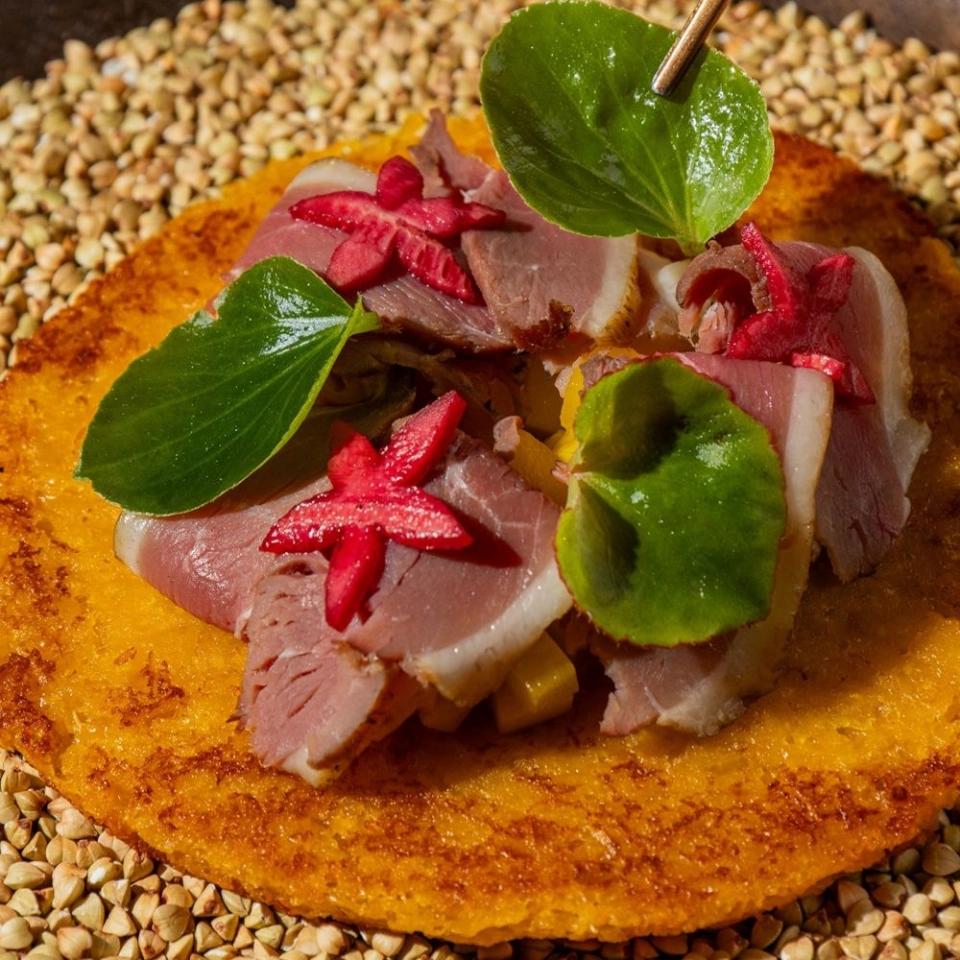 Арепа на кукурузной муке с колумбийским сыром, копченой фермерской уткой, чили и манговым чатни.