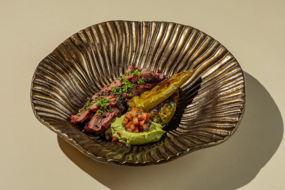 Выдержанная мраморная говядина с авокадо, ароматным зеленым перцем и семенами чиа.
