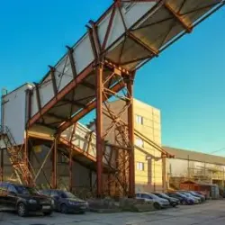 Это один из корпусов обанкротившегося в 2018 году производителя ЖБИ — Домостроительного комбината №5. Здесь находился корпус по производству железобетонных изделий, состоящий из формовочного, арматурного участков и бетоносмесительного участка с наклонными галереями. Цеха оснащены пятью мостовыми кранами и собственной компрессорной, а электроэнергия подается от отдельной подстанции мощностью 1 МВт.