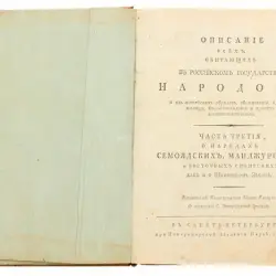 На зимнем аукционе Российского торгового дома будут представлены сразу два редких издания XVIII века, включенных в Национальный реестр книжных памятников. Одно из них — первая отечественная этнографическая монография, изданная в Санкт-Петербурге в 1799 году. «Описание всех обитающих в Российском государстве народов» сделано Георги Иоганном Готлибом, известным в те времена российским и немецким ученым, этнографом и путешественником. В своей монографии Готлиб впервые собрал и систематизировал сведения о различных сторонах культуры и быта народов России. Издание содержит 100 иллюстраций, выполненных в технике резцовой гравюры с акварельной подкраской, которые дают читателю полное представление об облике и национальном костюме народов России того времени. Стартовая цена лота — 950 тыс. рублей.