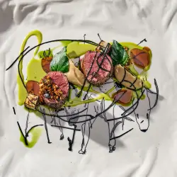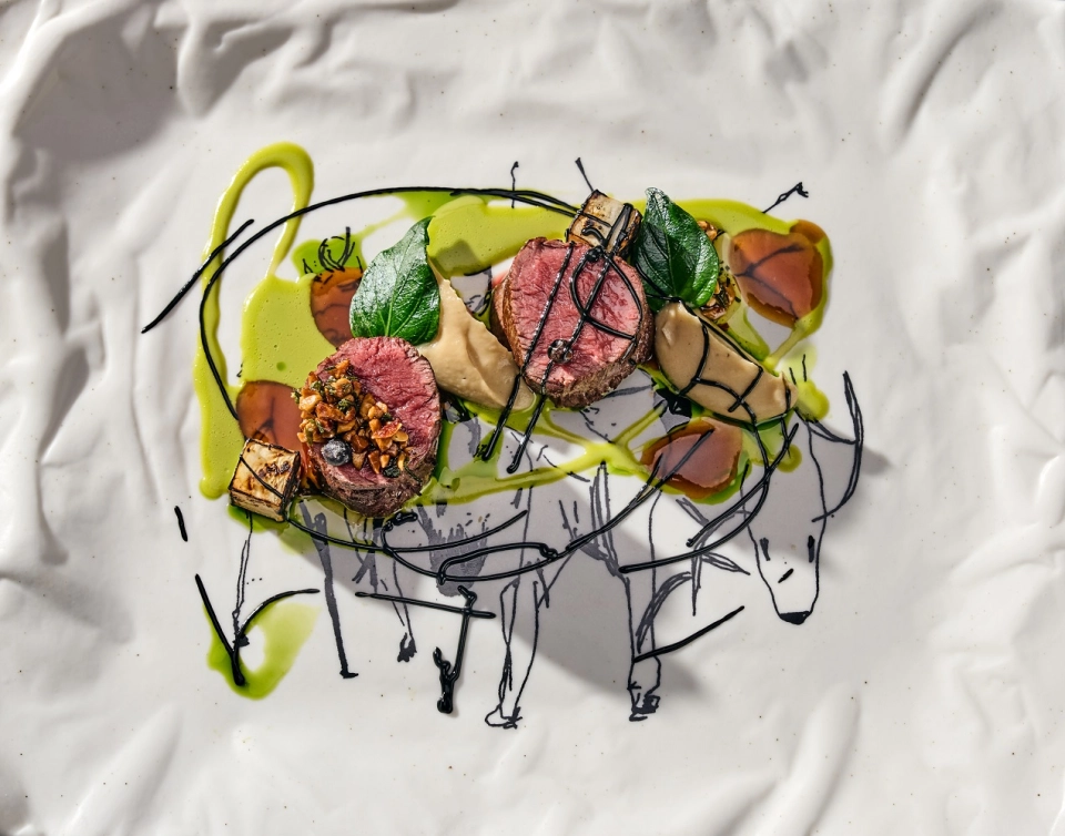 Завершает основную часть сета вырезка оленя с сельдереем в двух текстурах — копченый корень и пюре из сельдерея. В качестве дополнения выступают соус из черемши со свежей зеленью любистка, черный чеснок с фурикакэ из обжаренного миндаля и сублимированного можжевельника.