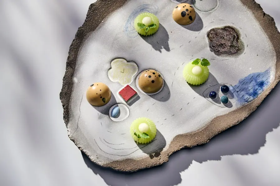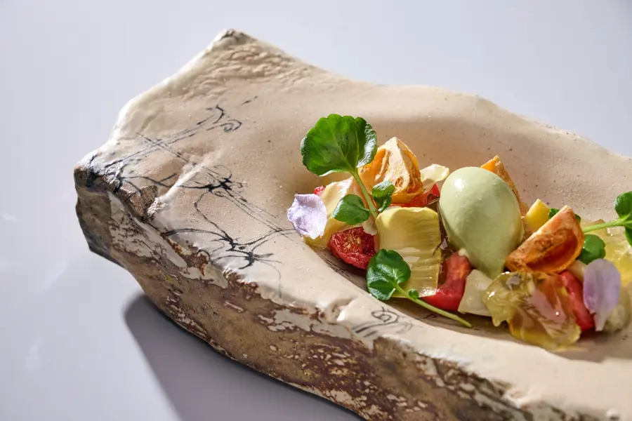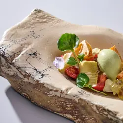 Первое основное блюдо — «Томаты в разных состояниях». В нем представлены три текстуры — сублимированный томат, подвяленный и свежий узбекский. Их сопровождают желе лайма, мороженое из шафрана, сегменты маринованного артишока и умами-крошка из водорослей.