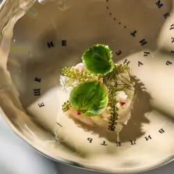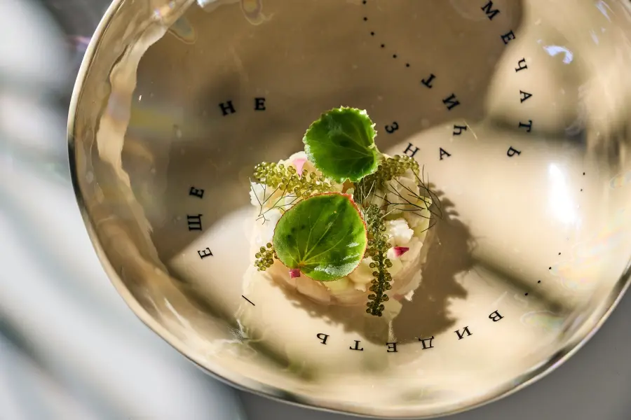 Следующий курс — морской гребешок. «Мы подаем его с маринованной цветной капустой и свежим огурцом, морским виноградом и орехом макадамии. Всё объединяет заправка из цветной капусты, юдзу и ванили», — рассказывает Артем.