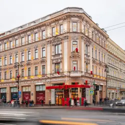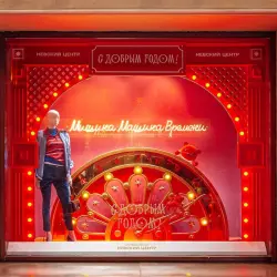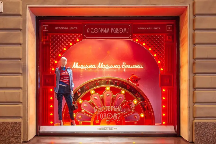 Каждая витрина — это отдельный новогодний сюжет. В одной из них красный мишка ищет сюрпризы в яйце Фаберже, в другой — двое сказочных сообщников переводят гигантские стрелки «Машины Времени». Косолапые герои дополняют концепции самих брендов, представленных в «Невском центре». В витрине бренда Robinzon мишка рассматривает афишу, а уже на следующей — сидит в театральном зале в ожидании праздничного представления. У Gloria Jeans мишка лепит себе подобного, только гигантского, снеговика. В витрине аптеки «36.6» герой путешествует в окружении воздушных шаров. «Наследникъ Выжанова» окружил мишек теплыми шерстяными вещами. А в витрине Togas, помимо основных персонажей, красуется символ 2026 года — конь, летящий ввысь среди одеял, подушек и подарков. У «Азбуки вкуса» тоже появляются другие герои русских сказок: Жар-птица и Конек-Горбунок.