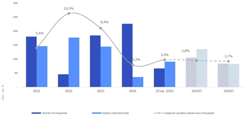 С января по октябрь 2025 г. в Санкт-Петербурге введено в эксплуатацию четыре объекта суммарной площадью 91 тыс. кв. м, а до конца года ожидается ввод ещё шести БЦ на 44,5 тыс. кв. м. Таким образом, всего в этом году общий объём ввода составит 135,5 тыс. кв. м, что почти в четыре раза больше, чем в 2024 г. (36,1 тыс. кв. м). Более 65% новых площадей, введенных и ожидаемых к вводу в этом году, уже законтрактованы. Из-за ограниченного предложения крупных качественных блоков арендаторы вынуждены ожидать освобождения помещений или рассматривать строящиеся объекты, что удлиняет сроки закрытия сделок. Средний уровень вакантности в качественных бизнес-центрах составил 3,9%: в объектах класса А вакантность 3,1%, в объектах класса B показатель составляет 4,3%.