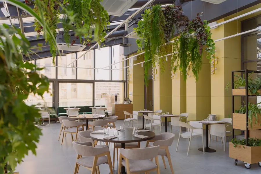 Акцентный интерьер в минималистичном дизайне разработан известным архитектором и дизайнером Михаилом Бархиным. В ресторане предусмотрели круглогодичную панорамную террасу, просторную летнюю веранду и детскую комнату с профессиональной няней для маленьких гостей.