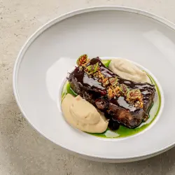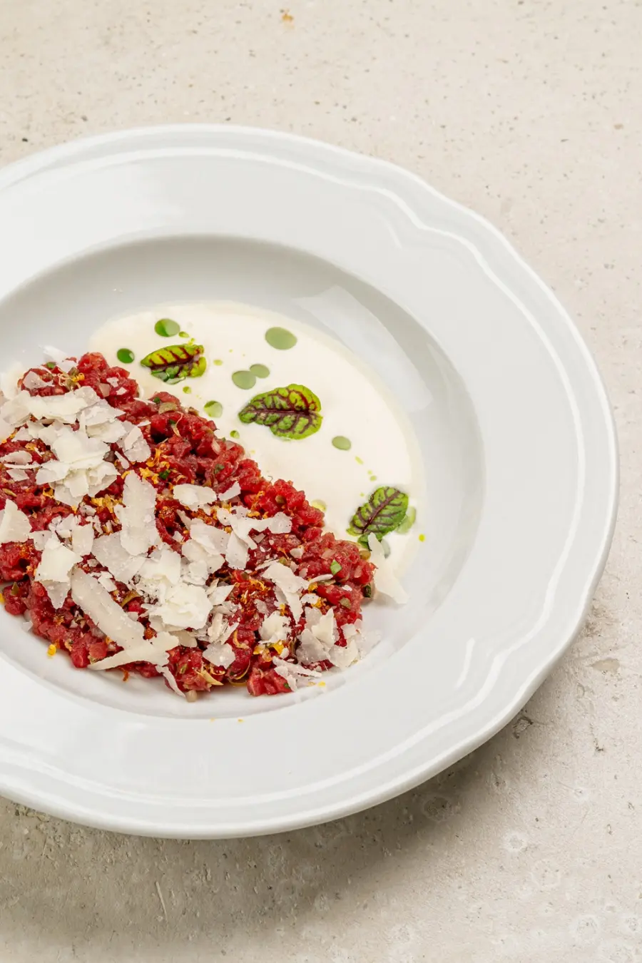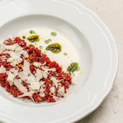 Ресторан расположен в спальном районе Петербурга, и теперь его жителям не нужно ехать в центр за особой гастрономией. Бондарец сделал акцент в меню на итальянские закуски и блюда raw: вителло тоннато с трюфелем, тартар из говядины с боттаргой и кедровыми сливками, севиче из тунца с томатами и апельсином. В основных блюдах — рапаны с печеным перцем и муссом из цветной капусты, угольная треска с зеленым гарниром и муссом сабайон, филе-миньон со шпинатным пюре и перечно-трюфельным соусом, скёрт-стейк с соусом чимичурри. Также есть классические итальянские разделы — с неаполитанской пиццей из подовой печи и домашней пастой.