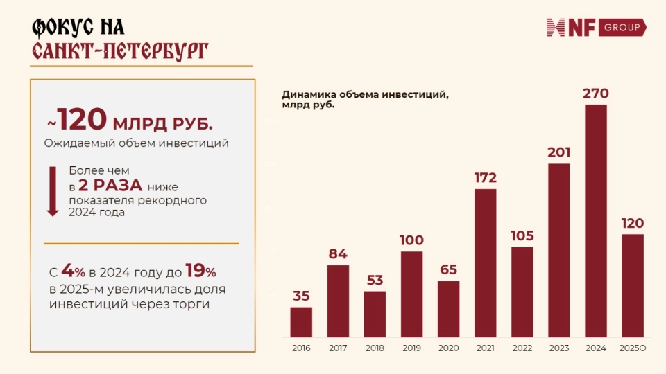 Объем инвестиций в коммерческую недвижимость и земельные участки Санкт-Петербурга по итогам 2025 года может составить 120 млрд рублей. Это больше чем в два раза ниже рекордного результата 2024 года, когда рынок достиг отметки в 270 млрд рублей.
