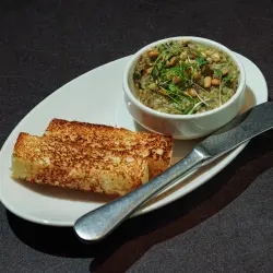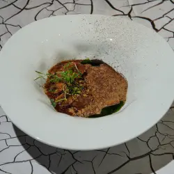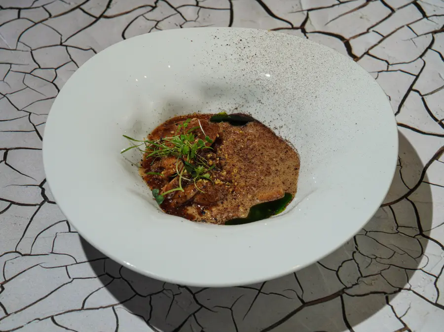 Новый раздел меню «Татарстан» — про культуру, а не географию. В салате с вяленым гусем — отсылка к татарской осенней традиции «Каз өмәсе», когда впрок заготавливали гусиное мясо и пух, а после общей работы накрывали большой стол. Тыква — типичный овощ для Татарстана, так что ее сладковатая мякоть и ореховые ноты фермерского сыра подчеркивают идею «домашней» сезонности в современной подаче этого салата.