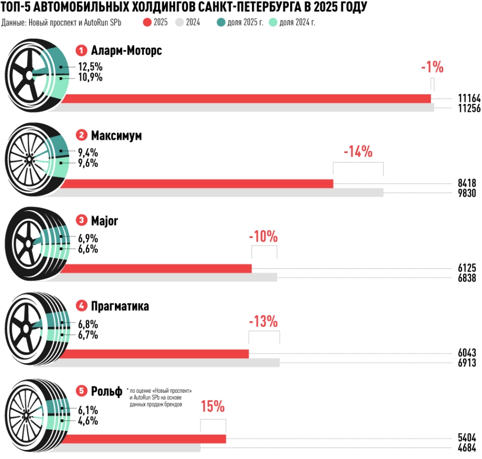 Лидером по итогам продаж в 2025 году стала группа компаний «Аларм-Моторс». Холдинг второй раз подряд занимает первое место. Как и в 2024 году, в петербургских дилерских центрах «Аларм-Моторс» было реализовано более 11 тыс. новых автомобилей — 11 164. Холдинг в 2025 году увеличил свою долю на рынке. Она составила 12,5% от общего объема продаж новых машин в регионе (в 2024 году — 10,9%).