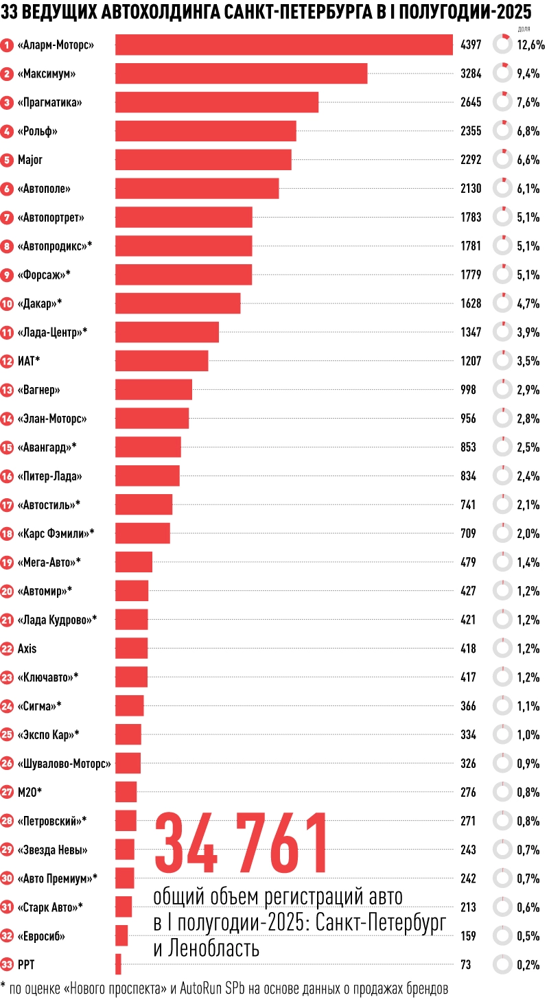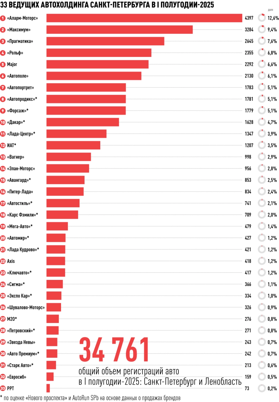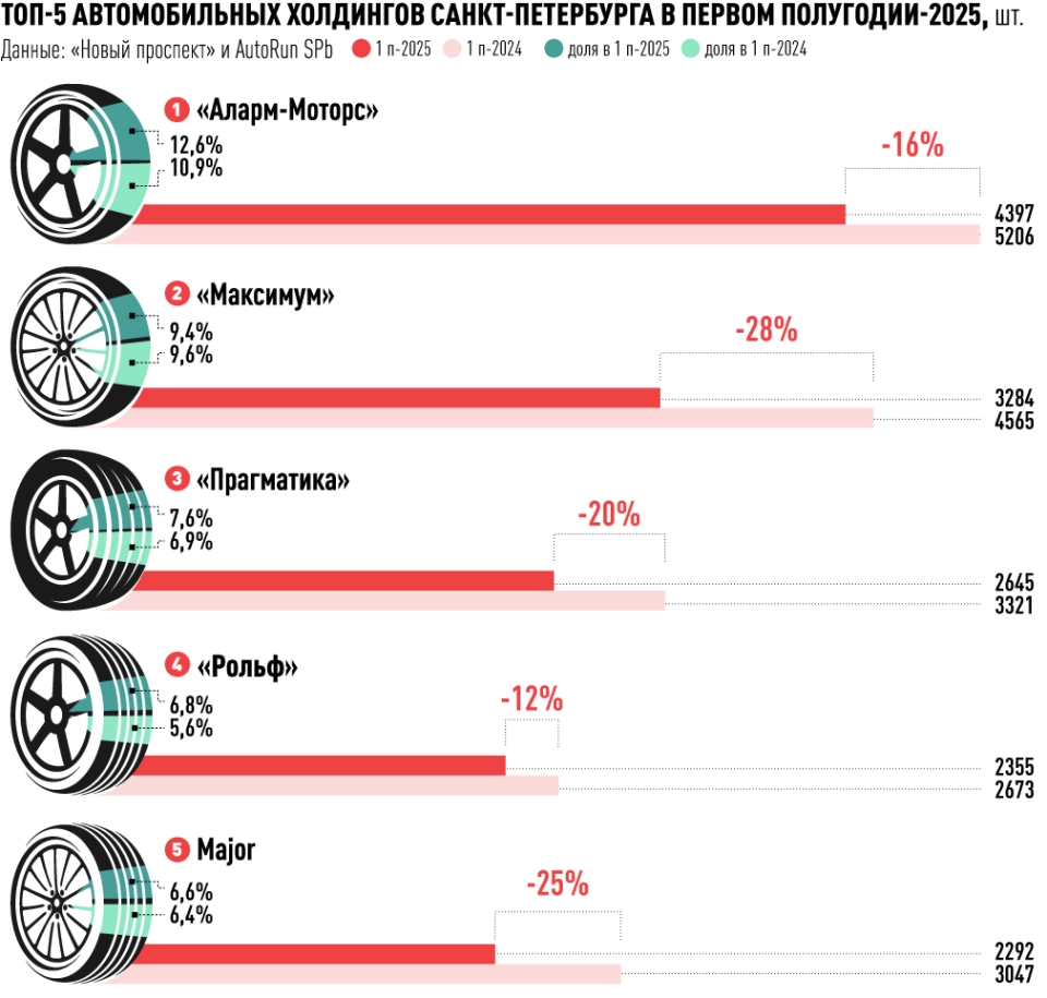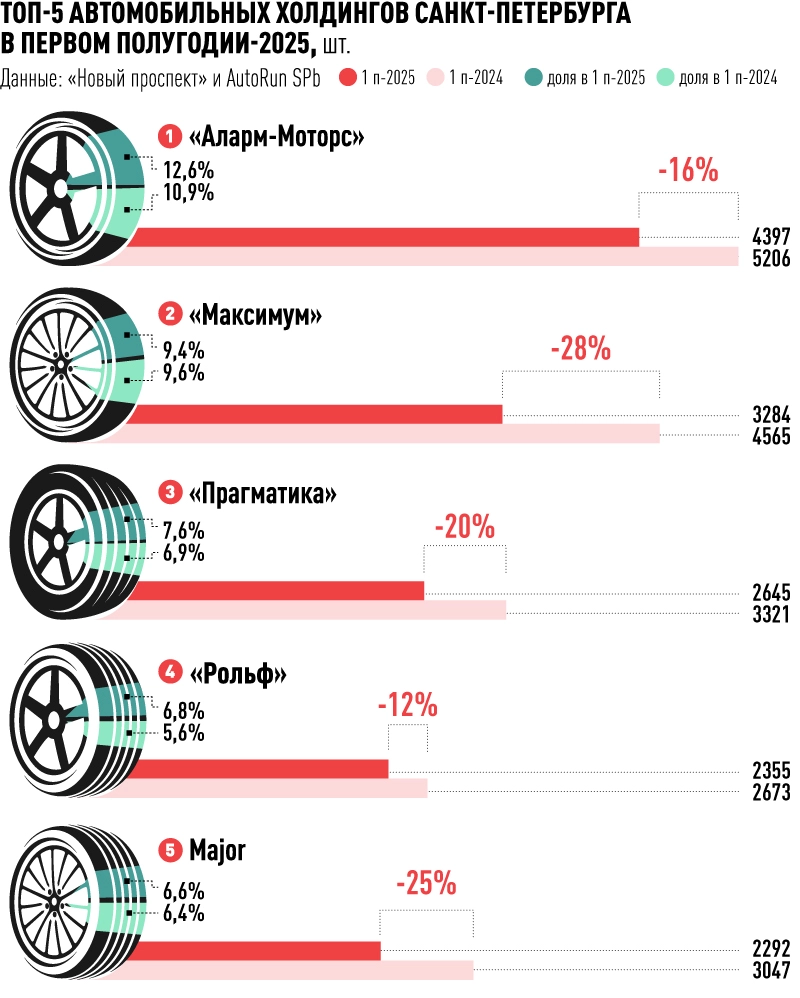 Как и по итогам 2024 года, рейтинг возглавила группа компаний «Аларм-Моторс». Холдинг оказался единственным в Петербурге, кому удалось преодолеть объем продаж в 4 тыс. машин за полгода (4 397 новых автомобилей). В топ-5 также вошли «Максимум», «Прагматика», «Рольф» и Major.