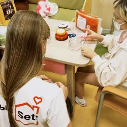 А еще, участники клуба «Добрый Setl» провели творческую встречу для детей из отделения химиотерапии онкогематологических заболеваний НМИЦ им. В.А. Алмазова. Волонтёры привезли материалы и подготовили мастер‑классы: создавали добрых монстриков из помпонов и свечи из насыпного воска, а еще украшали подсвечники. В завершение устроили дружеские посиделки с чаепитием и добрыми беседами.