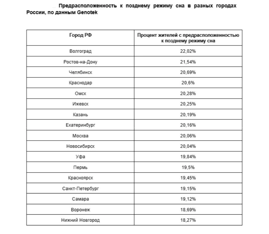 Специалисты компании Genotek проанализировали более 166 тысяч геномов жителей России, представляющих разные этнические группы. Исследование показало, что больше всего «сов» среди чеченцев, а меньше всего — среди азербайджанцев.