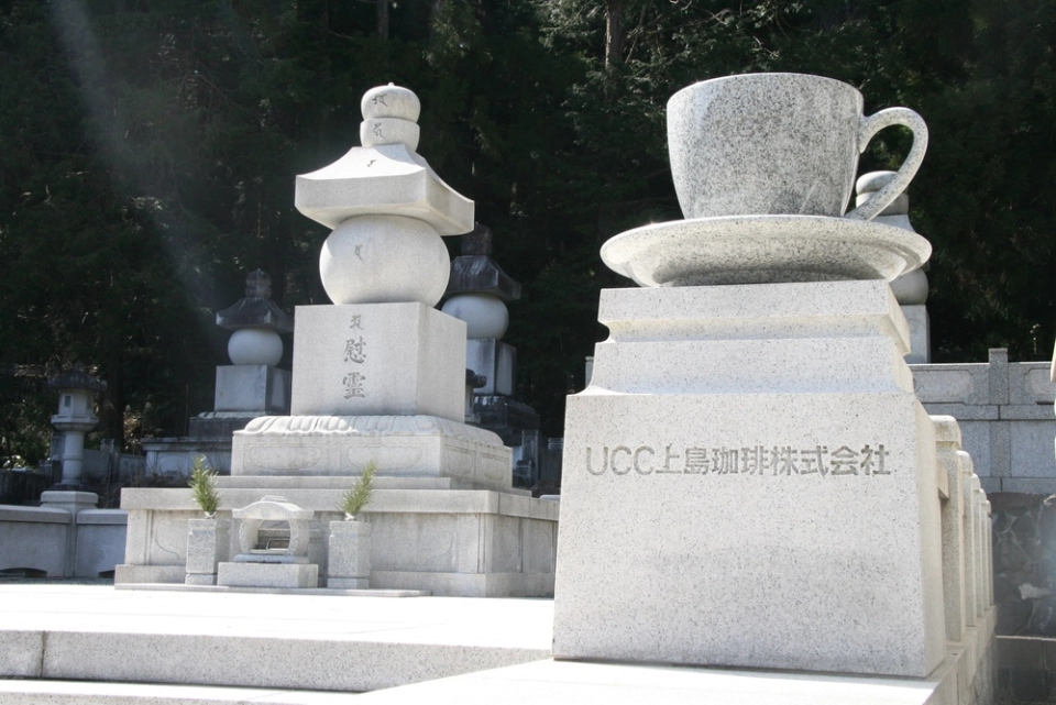 Корпоративная могила Ueshima Coffee Company (UCC), производящей кофе, на кладбище Коя-сан. В чашке перемешан прах сотрудников компании