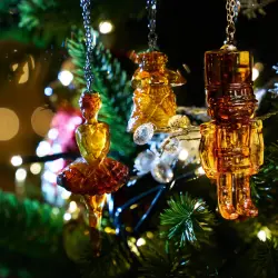 Фигурки героев для елочных игрушек являются примером одной из классических технологий ювелирного искусства — художественной резьбы по янтарю. Мастер использует уникальный цвет, прозрачность и теплоту камня для создания детализированных и реалистичных произведений.